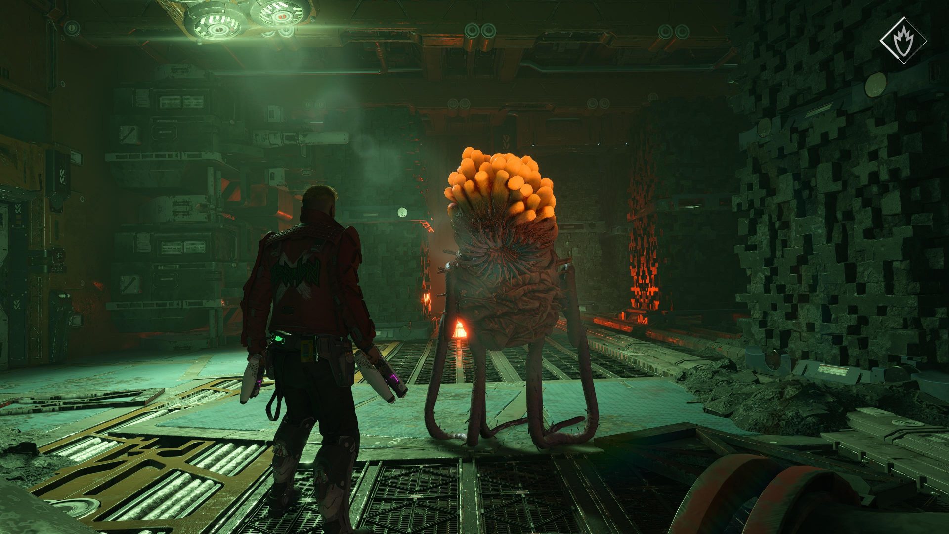 Вот вы прочитали мое описание сюжетной завязки и наверняка подумали, что история уж слишком простая, но это не так. На самом деле по ходу игры сюжет получает грандиозное развитие и приводит к тому, чего по началу и в помине нет. Конечно же в центре внимания будет лидер стражей Питер Квилл, прозвавший себя Звездным Лордом. По сюжету он встретит свою давнишнюю влиятельную любовницу Ко-Рел и ее гонористую 12-летнюю дочку. Между прочим нам открывают секрет “Звезданутого Лорда”, ведь он крутил шуры-муры с Ко-Рел как раз 12 лет назад – ну, вы поняли. Кроме того история расскажет и о детстве Квилла через слегка трогательные и милые флешбеки. В ходе игры сюжетный клубок ниток будет быстро распутываться и связываться в цельный свитер нарратива. Вы постоянно будете встречать новых персонажей, попадать в новые неожиданные ситуации и с изумлением следить за трансформацией взаимоотношений между героями, при этом все это будет происходить в невероятной динамике. Сам сюжет полон нелепых и циничных моментов, свойственных вселенной, но и место для драматургии в нем тоже нашлось.